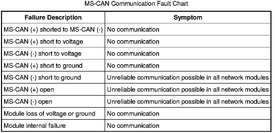 The following fault chart describes the specific MS-CAN failures and their resulting symptom: