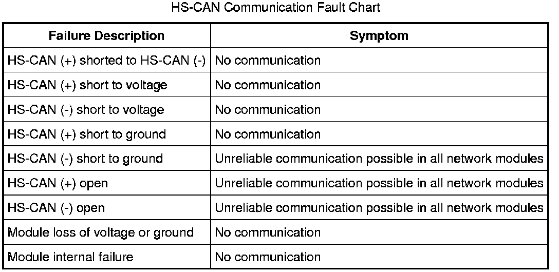 The following fault chart describes the specific HS-CAN failures and their resulting symptom: