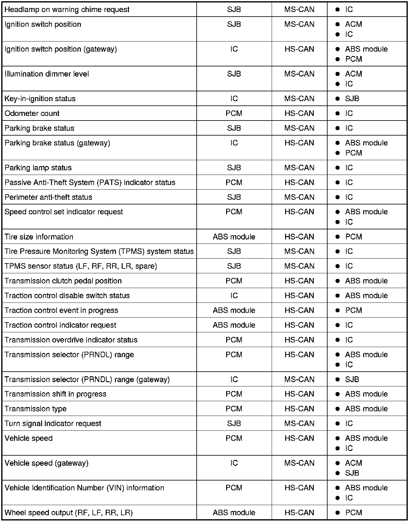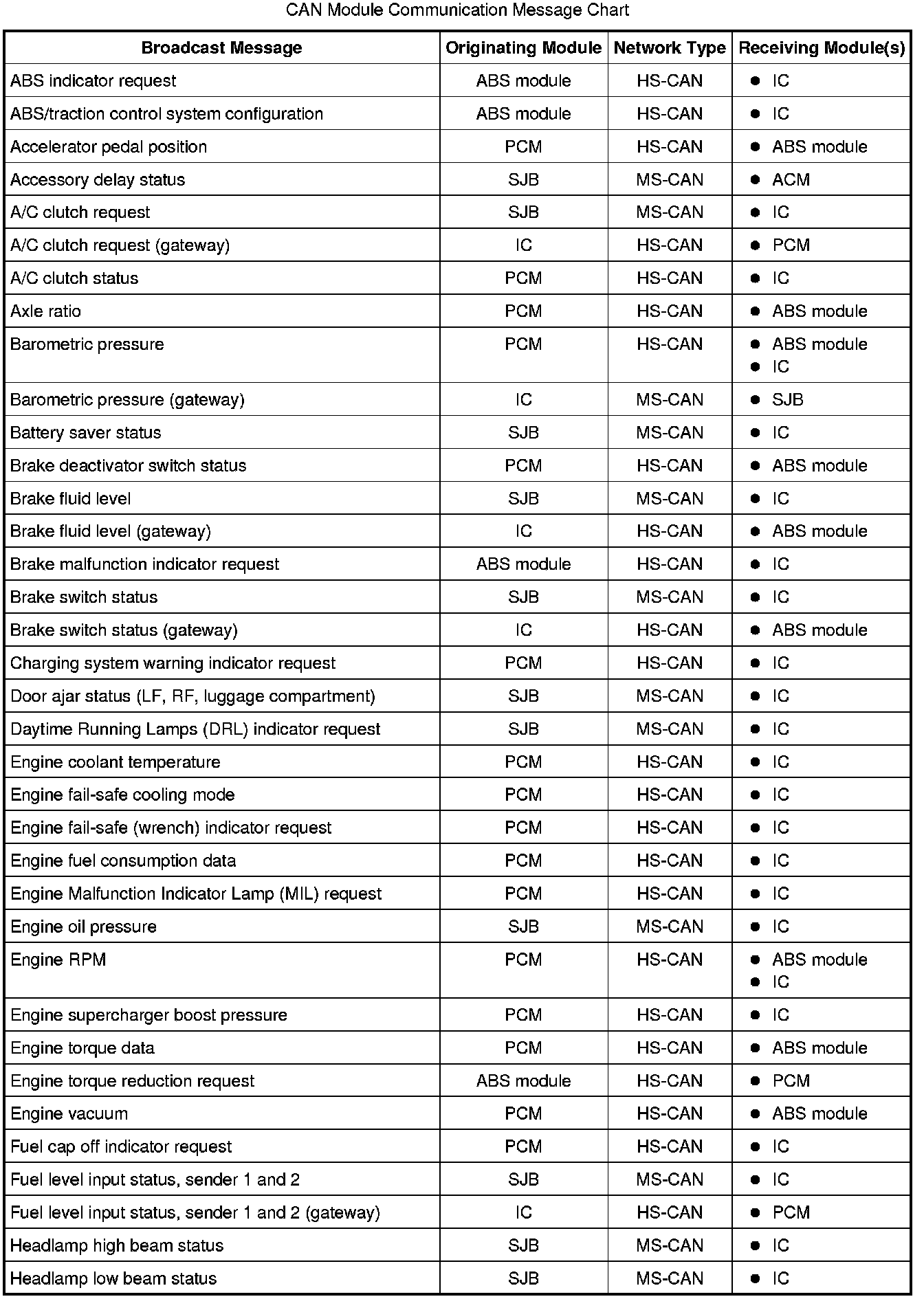 The HS-CAN uses an unshielded twisted pair cable of data (+) and data (-) circuits. The data (+) and the data (-) circuits are each regulated to approximately 2.5 volts during neutral or rested network traffic. As bus messages are sent on the data (+) circuit, voltage is increased by approximately 1.0 volt. Inversely, the data (-) circuit is reduced by approximately 1.0 volt when a bus message is sent. Multiple bus messages can be sent over the CAN circuits allowing multiple modules to communicate with each other. The HS-CAN is a high speed communication network used for the IC, the PCM and the ABS module (if equipped) communications, and designed for real time information transfer and control. The HS-CAN will not communicate while certain faults are present, but will operate with diminished performance with other faults present. The HS-CAN bus may remain operational when 1 of the 2 termination resistors are not present.