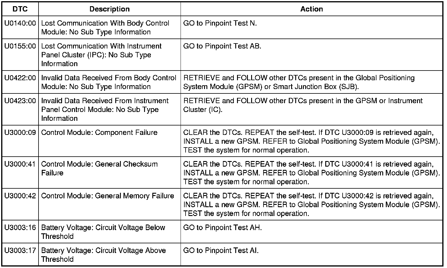 NOTE: This module utilizes a 5-character DTC followed by a 2-character failure-type code. The failure-type code provides information about specific fault conditions such as opens, or shorts to ground. Continuous memory DTCs have an additional 2-character DTC status code suffix to assist in determining DTC history.