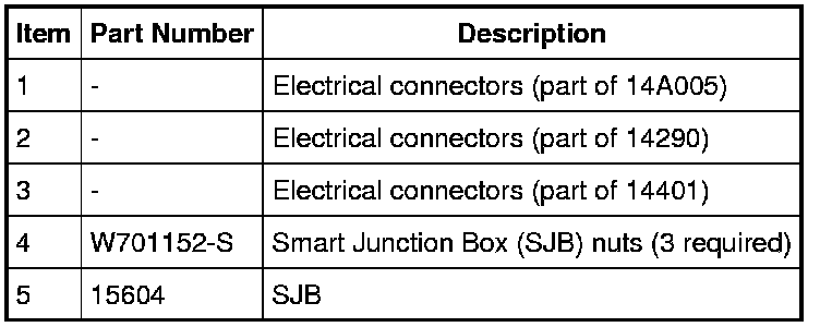 NOTE: Prior to the replacement of the module, it is necessary to upload the module configuration information to a scan tool. This information must be downloaded into the new Smart Junction Box (SJB) after installation. For additional information, refer to Information Bus. In the event that As-Built data is required (SJB does not communicate), all Remote Keyless Entry (RKE) devices must be programmed to the new SJB. A minimum of 2 devices are necessary to complete the configuration and turn off the flashing interior lights.