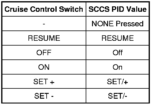 - Press each cruise control switch while monitoring the cruise control switch PID (SCCS).
