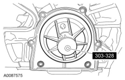 NOTICE: Do not loosen or remove the crankshaft pulley bolt without first installing the special tools as instructed in this procedure. The crankshaft pulley and the crankshaft timing sprocket are not keyed to the crankshaft. The crankshaft, the crankshaft sprocket and the pulley are fitted together by friction, using diamond washers between the flange faces on each part. For that reason, the crankshaft sprocket is also unfastened if the pulley bolt is loosened. Before any repair requiring loosening or removal of the crankshaft pulley bolt, the crankshaft and camshafts must be locked in place by the special service tools, otherwise severe engine damage can occur.