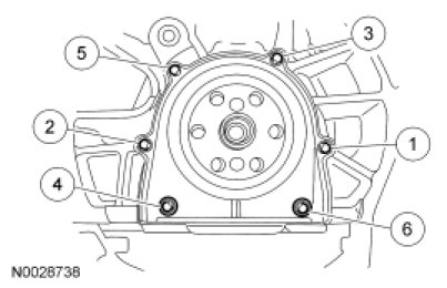 26. Tighten the 6 crankshaft rear seal with retainer plate bolts in the sequence shown.