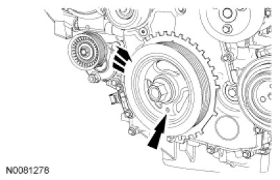 41. NOTICE: The crankshaft must remain in the Top Dead Center (TDC) position during removal of the pulley bolt or damage to the engine can occur. Therefore, the crankshaft pulley must be held in place with the Crankshaft Damper Holding Tool and the bolt should be removed using an air impact wrench (1/2-in drive minimum).