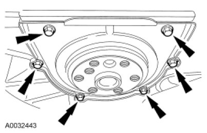NOTICE: The crankshaft sprocket diamond washer may come off with the crankshaft pulley. The diamond washer must be replaced, remove and discard the diamond washer. If the diamond washer is not installed, engine damage may occur.