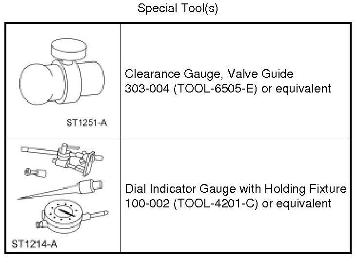 Install a Valve Guide Clearance Gauge on the valve stem and install a Dial Indicator Gauge with Holding Fixture. Lower the valve until the clearance gauge contacts the upper surface of the valve guide.