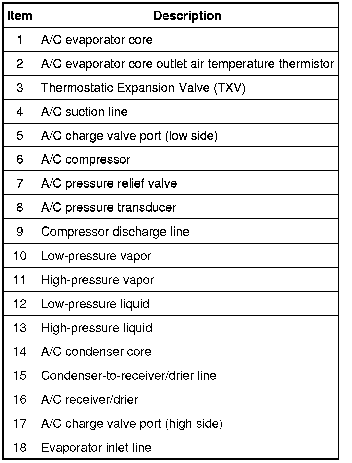 A thermistor which monitors the temperature of the air that has passed through the evaporator core controls A/C clutch cycling. If the temperature of the evaporator core discharge air is low enough to cause the condensed water vapor to freeze, the A/C clutch is disengaged by the vehicle PCM.