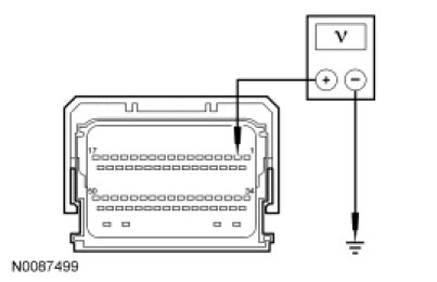 - Measure the voltage between ground and PCM C175B-2, circuit CH302 (WH/BN), harness side.