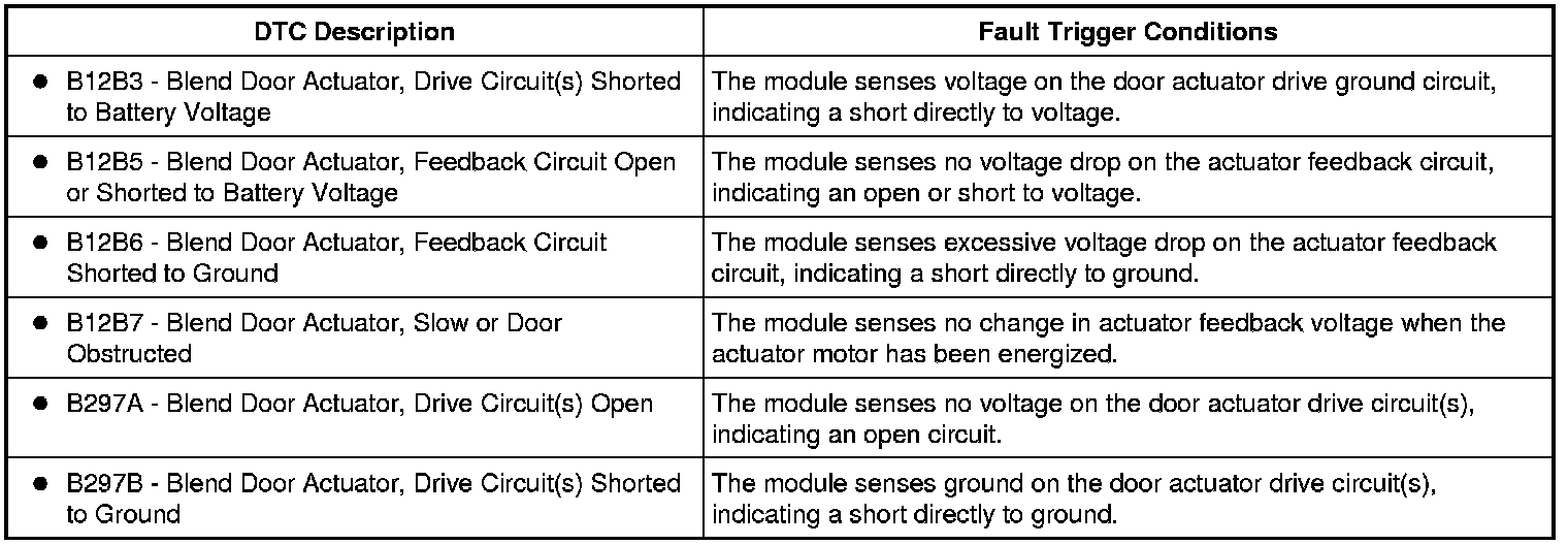 For DTC B12B7, INSPECT for binding/damaged linkage or door. REPAIR as necessary. If no condition is found, INSTALL a new door actuator. If a new actuator is installed, CONNECT the actuator electrical connector before the HVAC module connector(s). This will allow the new actuator to be calibrated when the HVAC module is reconnected. CLEAR the DTCs. REPEAT the self-test. TEST the system for normal operation.
