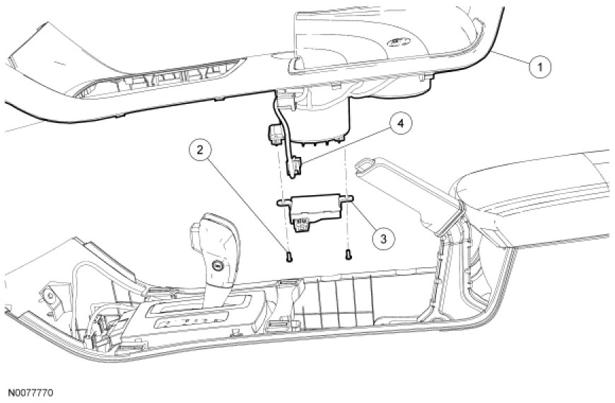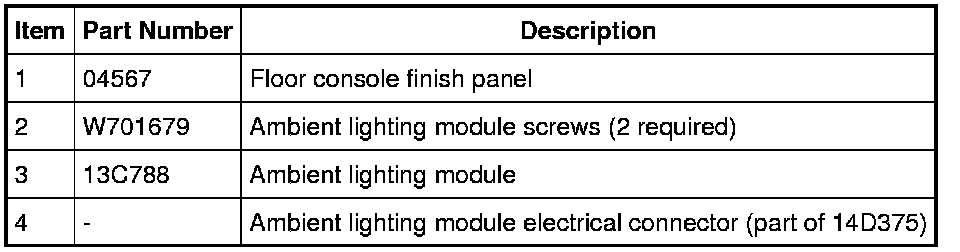 2. NOTE: The ambient lighting module is mounted under the bottom of the floor console finish panel cup holder.