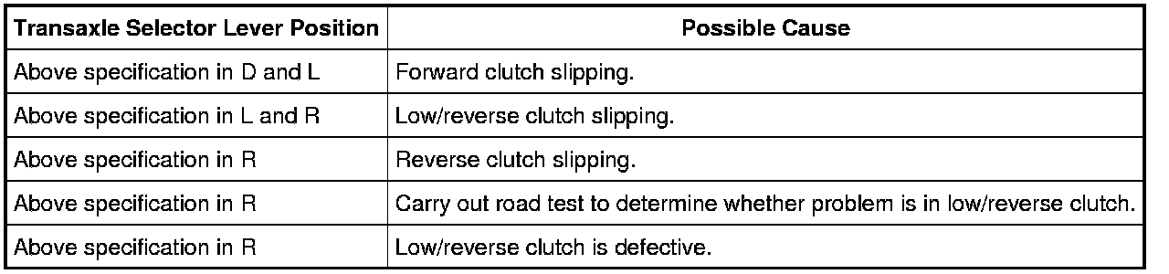 NOTICE: If the engine rpm recorded by the tachometer exceeds maximum specified rpm, release the accelerator pedal immediately, or further transaxle damage will occur. Clutch or band slippage is indicated.