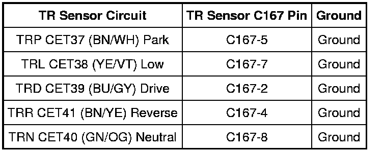 NOTE: Refer to the Transmission Range (TR) Sensor Diagnosis PID Chart within the Transaxle Connector Layouts Transaxle Connector Layouts procedure.
