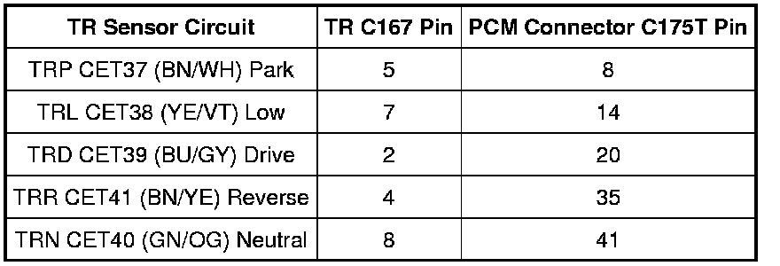 Transmission Range (TR) Sensor Diagnostic PID Chart in Transaxle Connector Layouts Transaxle Connector Layouts.