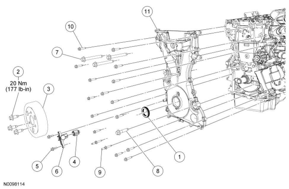 3. Install the engine front cover. Tighten the bolts in the sequence shown, to the following specifications: