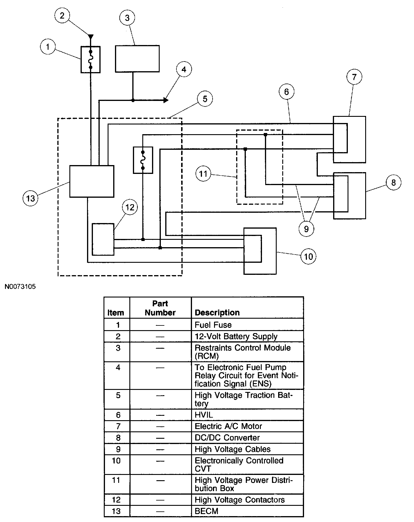 The HVIL circuit, used in conjunction with the restraints system event notification signal, disables the vehicle if a collision occurs or an open circuit concern in the high voltage connection is detected. The HVIL circuit is internal to the high voltage harness, which connects the high voltage traction battery, the electronically controlled CVT, the electric A/C motor and the DC/DC converter. The transaxle control module (TCM) and the battery energy control module (BECM) monitor the HVIL circuit for a low battery voltage. Whenever that voltage drops below a calibrated threshold, the high voltage traction battery immediately opens its high voltage contactors, the electronically controlled CVT discharges the high voltage capacitors, and the TCM stores the DTC P0A0A. This action is initiated when the vehicle is disabled and cannot be driven.