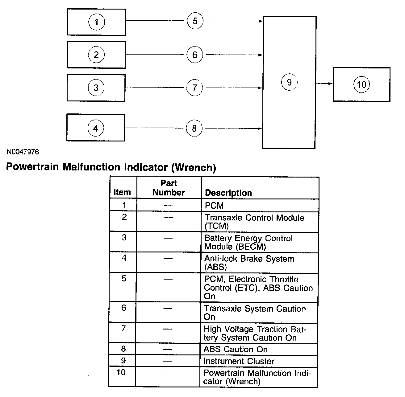 The powertrain malfunction indicator (wrench) illuminates whenever a concern within the hybrid electric system is detected and a repair is needed. When the concern is present, the control module that detected the concern stores the diagnostic trouble code (DTC) and broadcasts a caution on CAN message to the instrument cluster. Upon receiving the CAN message, the instrument cluster turns the indicator on.