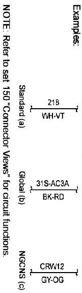 Connector Views show the views of the pins and/or cavities of all connectors. The pin and cavity sides are shown separately as if the connector were disconnected. The color of the connector housing is indicated next to the connector number when available. The harness causal number is located above the connector view and below the connector number. The circuit function charts are located below each connector. The wiring harness designations are listed in Component Location Charts.