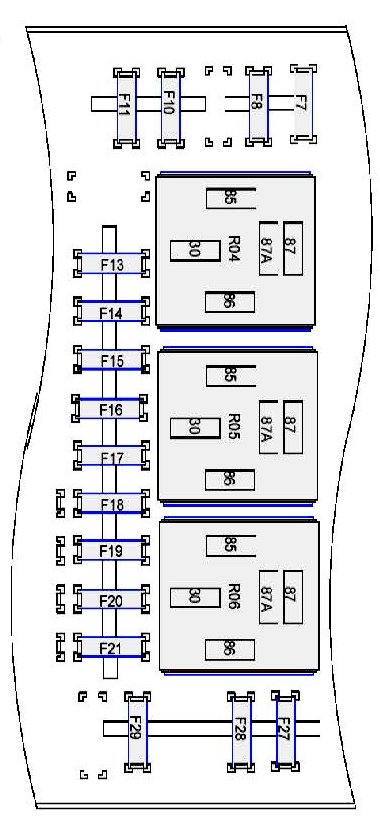 Fuse/Locations and Relay/Locations contains a view of the fuse/relay box, in which fuses and relays are identified, numbered and named. Fuse and relay numbering and naming follow the indication of the fuse panel cover. In addition, for all removable relays, pin positions are added to illustrate proper orientation.