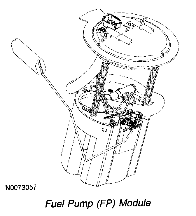 The FP module is a device that contains the fuel pump and sender assembly. The fuel pump is located inside the FP module and supplies fuel through the FP module manifold to the engine and FP module jet pump. The jet pump continuously refills the reservoir with fuel, and a check valve located in the manifold outlet maintains system pressure when the fuel pump is not energized. A flapper valve located in the bottom of the reservoir allows fuel to enter the reservoir and prime the fuel pump during the initial fill.