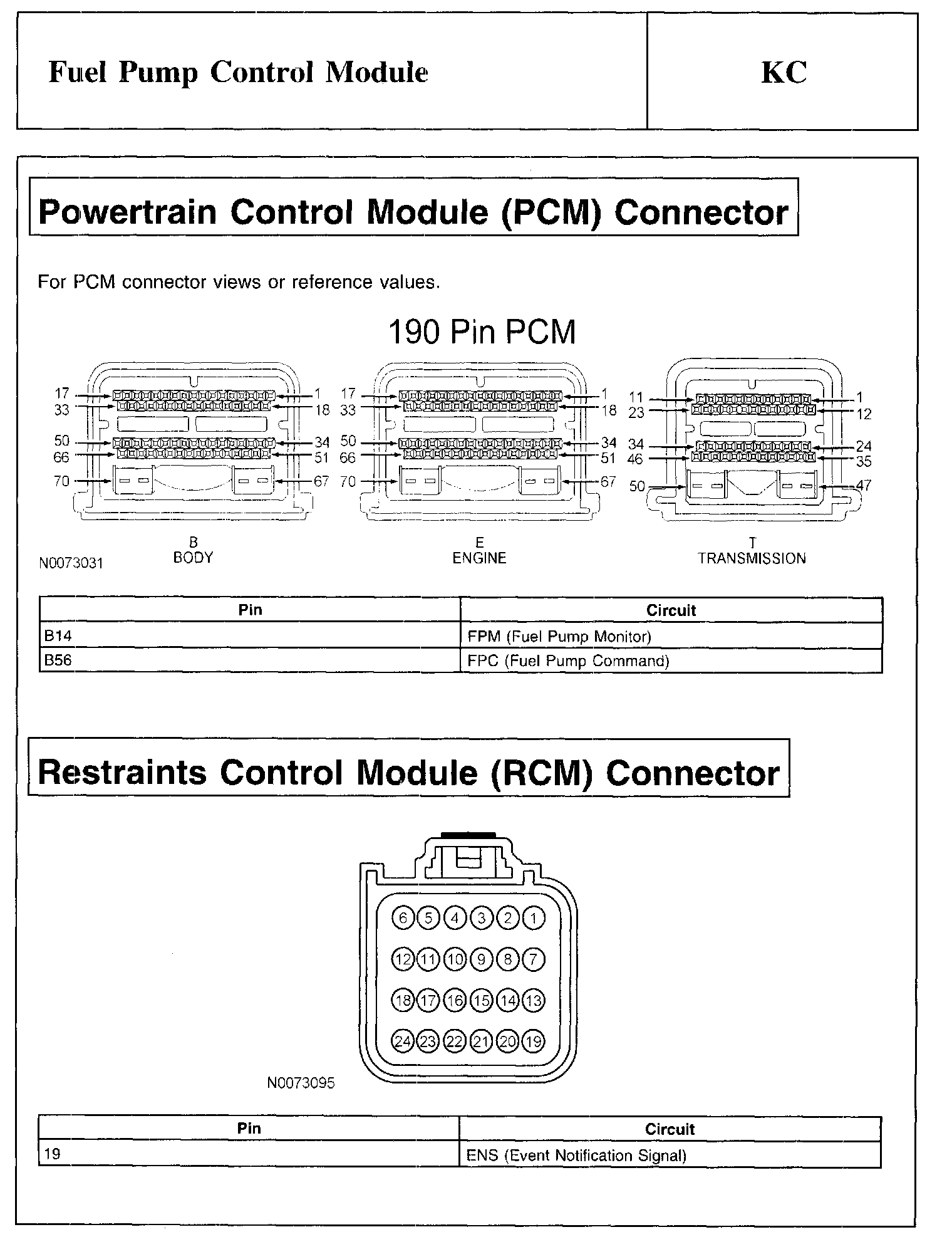 PINPOINT TEST KC: FUEL PUMP CONTROL MODULEWarning And Fuel Pump Connector Module Connector: