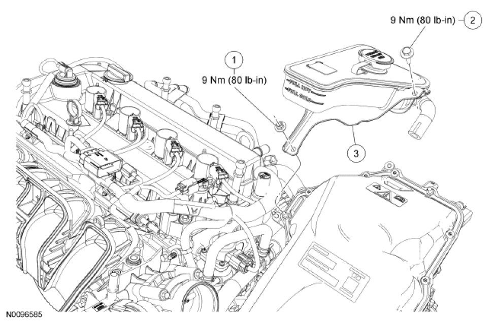 8. Remove the bolt and the nut and position the Motor Electronics Cooling System (MECS) coolant expansion tank aside.