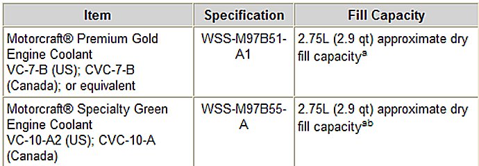 Early build vehicle (built before July 6, 2009) cooling Systems are filled with Motorcraft Premium Gold Engine Coolant. Late build vehicle (built on or alter July 6, 2009) cooling systems are filled with Motorcraft Specialty Green Engine Coolant. Mixing coolant types degrades the corrosion protection of the coolant. Do not mix coolant types. Failure to follow these instructions may result in engine or cooling system damage.