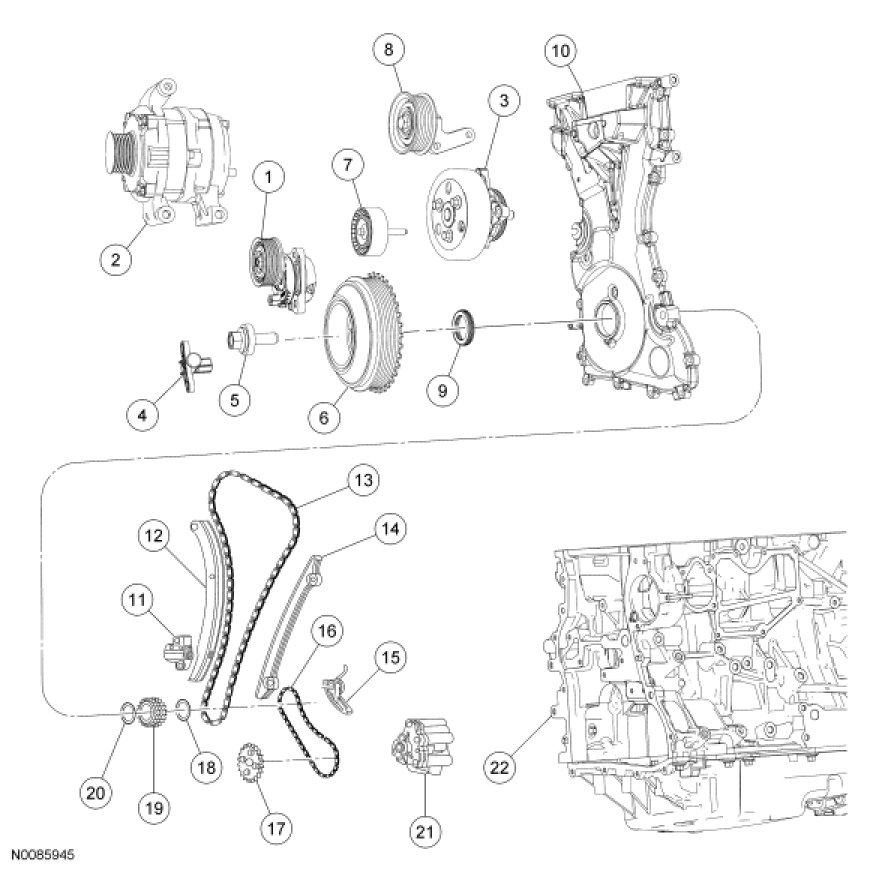 NOTICE: Do not loosen or remove the crankshaft pulley bolt without first installing the special tools as instructed in this procedure. The crankshaft pulley and the crankshaft timing sprocket are not keyed to the crankshaft. The crankshaft, the crankshaft sprocket and the pulley are fitted together by friction, using diamond washers between the flange faces on each part. For that reason, the crankshaft sprocket is also unfastened if the pulley bolt is loosened. Before any repair requiring loosening or removal of the crankshaft pulley bolt, the crankshaft and camshafts must be locked in place by the special service tools, otherwise severe engine damage can occur.