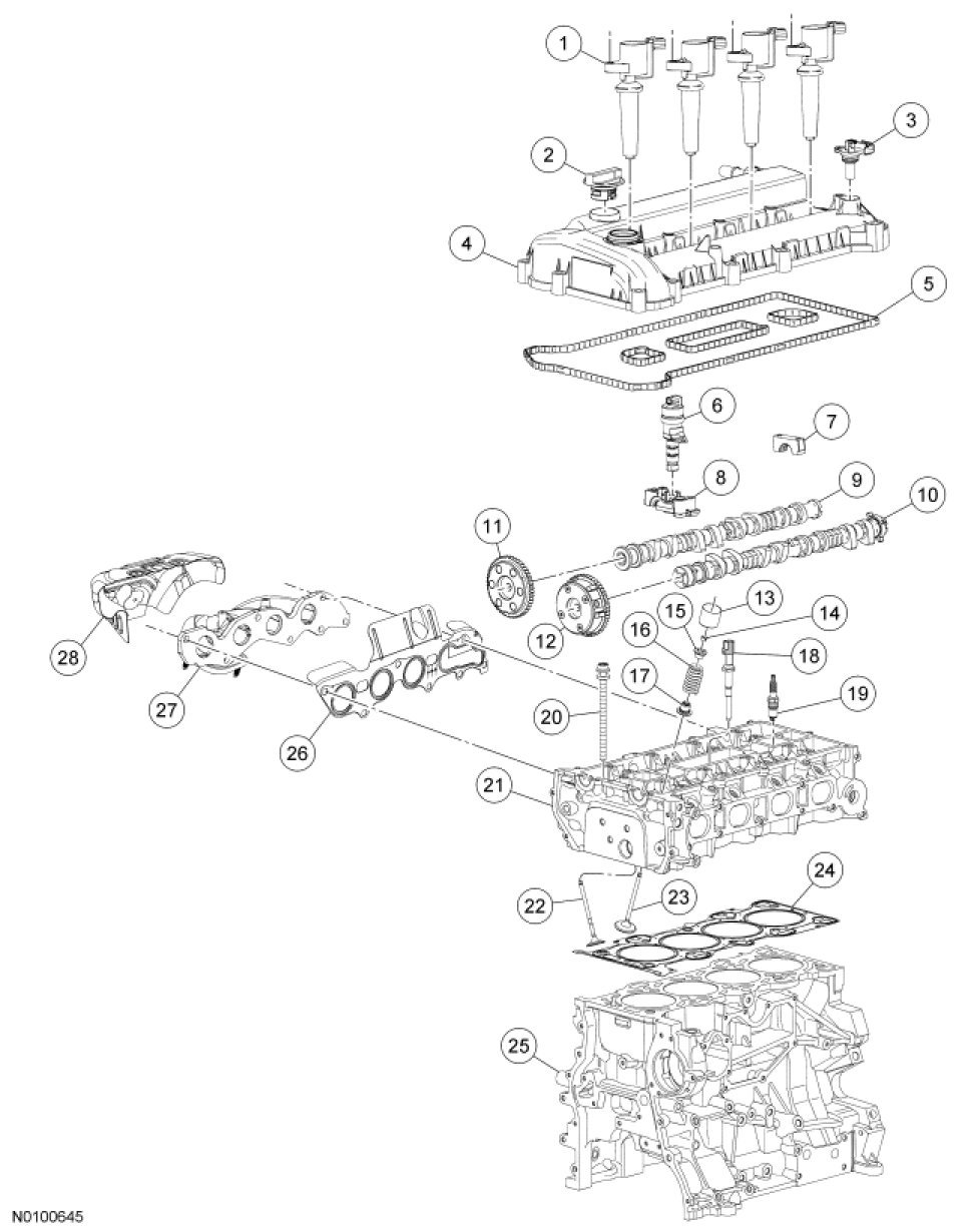 46. Install the Variable Camshaft Timing (VCT) system oil filter and the plug in the intake camshaft thrust cap.