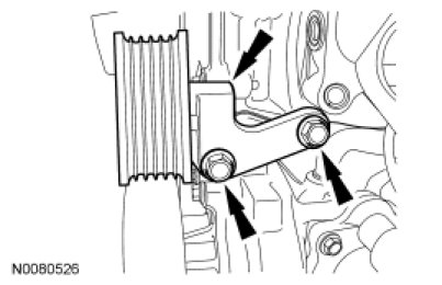 NOTICE: Do not loosen or remove the crankshaft pulley bolt without first installing the special tools as instructed in this procedure. The crankshaft pulley and the crankshaft timing sprocket are not keyed to the crankshaft. The crankshaft, the crankshaft sprocket and the pulley are fitted together by friction, using diamond washers between the flange faces on each part. For that reason, the crankshaft sprocket is also unfastened if the pulley bolt is loosened. Before any repair requiring loosening or removal of the crankshaft pulley bolt, the crankshaft and camshafts must be locked in place by the special service tools, otherwise severe engine damage can occur.