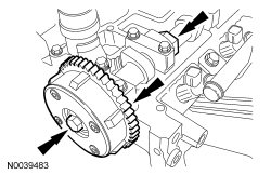 Using the flats on the camshaft to prevent camshaft rotation, remove the bolt and the exhaust camshaft sprocket.