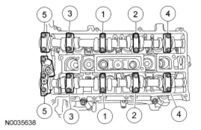 Install the camshafts and bearing caps in their original locations and orientation. Tighten the bearing caps in the sequence shown in 3 stages: