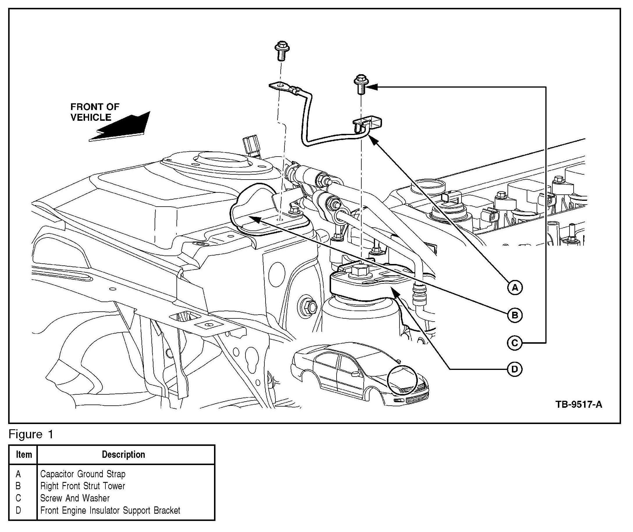1. Remove existing ground strap located on right hand side strut tower and discard.