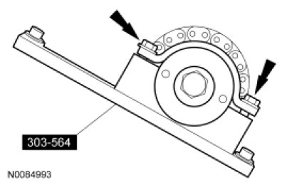 Position the camshaft timing slots below the centerline of the camshaft to correctly fit the Adapter, and install the Camshaft Holding Tool and Adapter on the rear of the LH cylinder head.