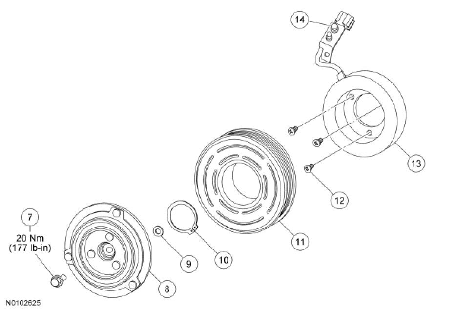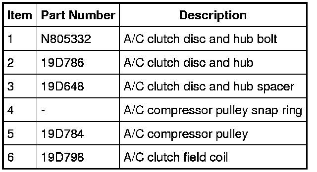8. NOTICE: Do not use air tools. Damage to the Air Conditioning (A/C) clutch field coil or A/C compressor may result.