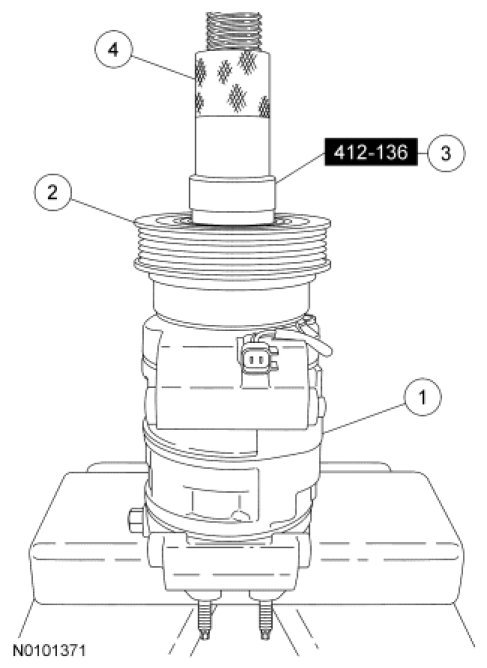 7. NOTE: The Air Conditioning (A/C) compressor must be positioned on the press so that only the flat part of the A/C compressor housing is contacting the base with the A/C compressor shaft aligned with the center of the press shaft. If the A/C compressor is not installed correctly on the press, the A/C compressor and/or A/C compressor pulley will be damaged.