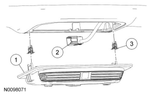 1. Pull the overhead console straight down, releasing the 2 side retaining clips.