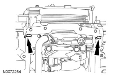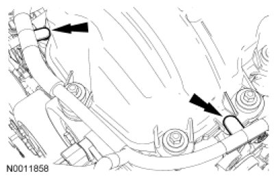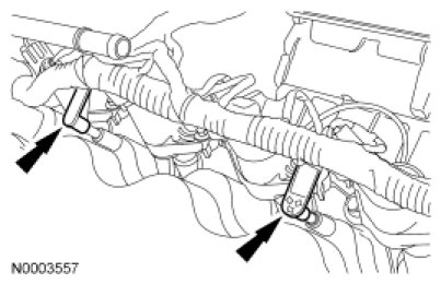 97. Connect the 2 engine wiring harness retainers to the LH valve cover studs.