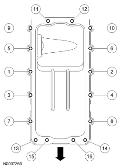 113. Install the new oil pan gasket and the oil pan and loosely install the 16 bolts.