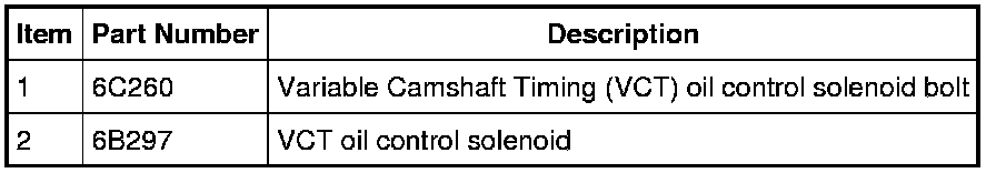 2. Remove the bolt and the Variable Camshaft Timing (VCT) oil control solenoid.