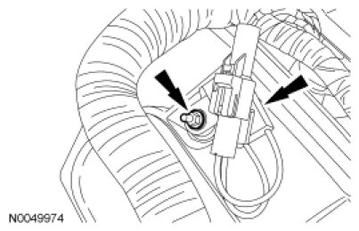 90. Connect the Engine Oil Pressure (EOP) switch electrical connector and the 2 wiring harness pin-type retainers.
