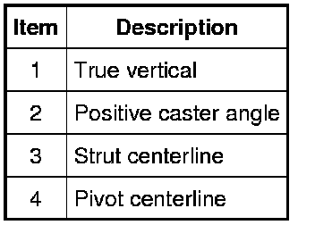 Caster is the deviation from vertical of an imaginary line drawn through the pivot points (top of strut and lower ball joint), when viewed from the side. The caster specifications will give the vehicle the best directional stability characteristics when loaded and driven. The caster setting is not related to tire wear.
