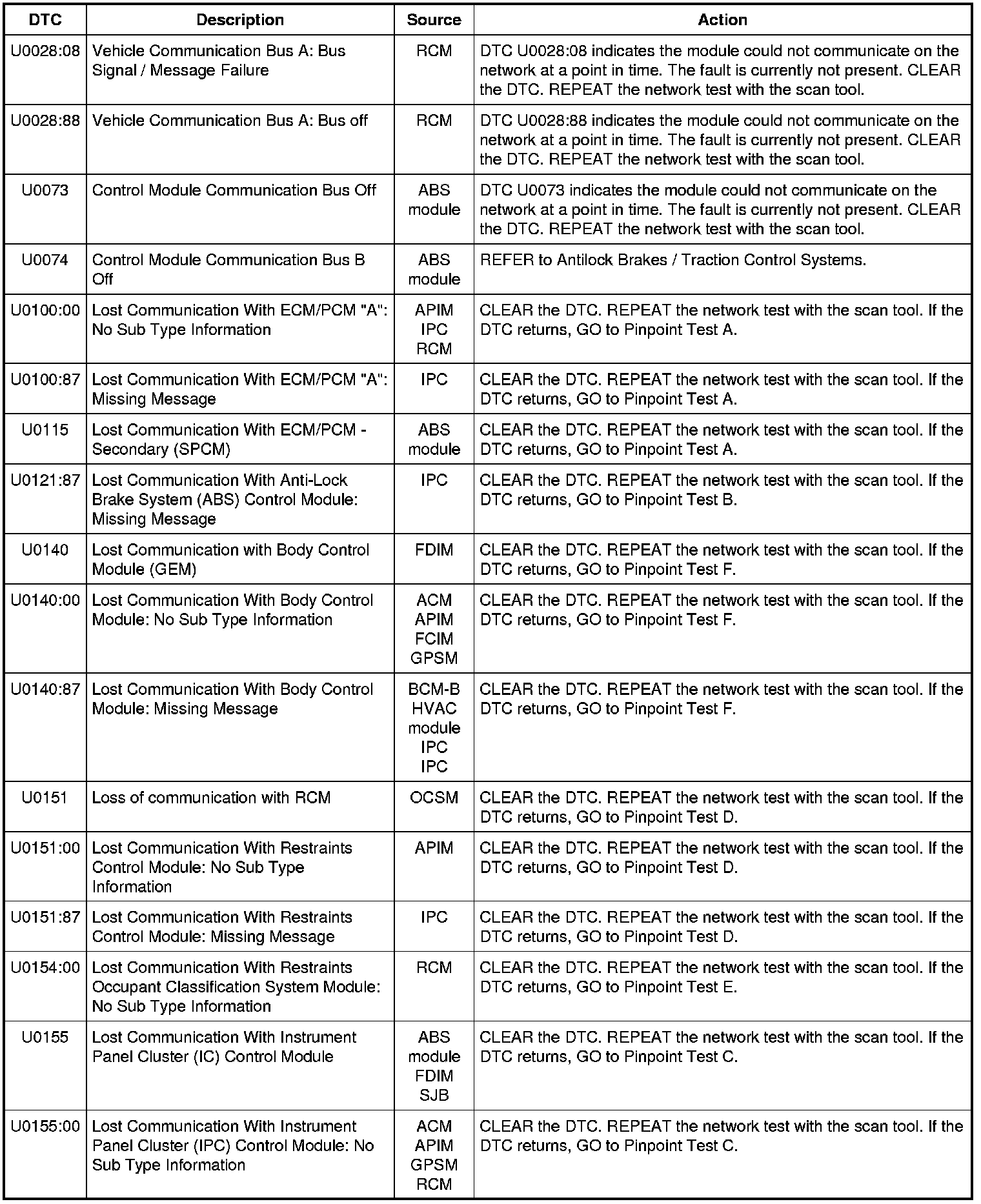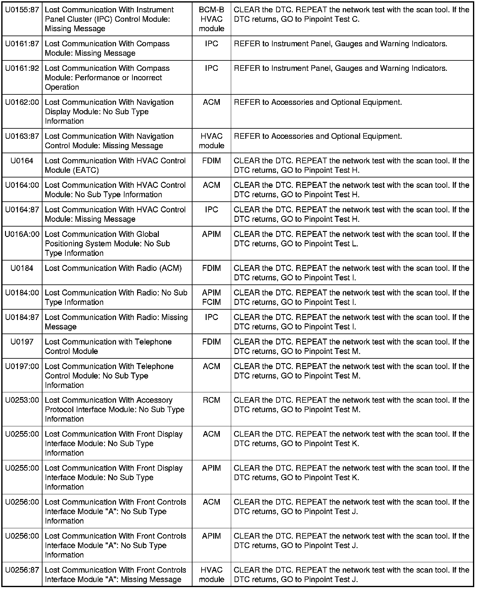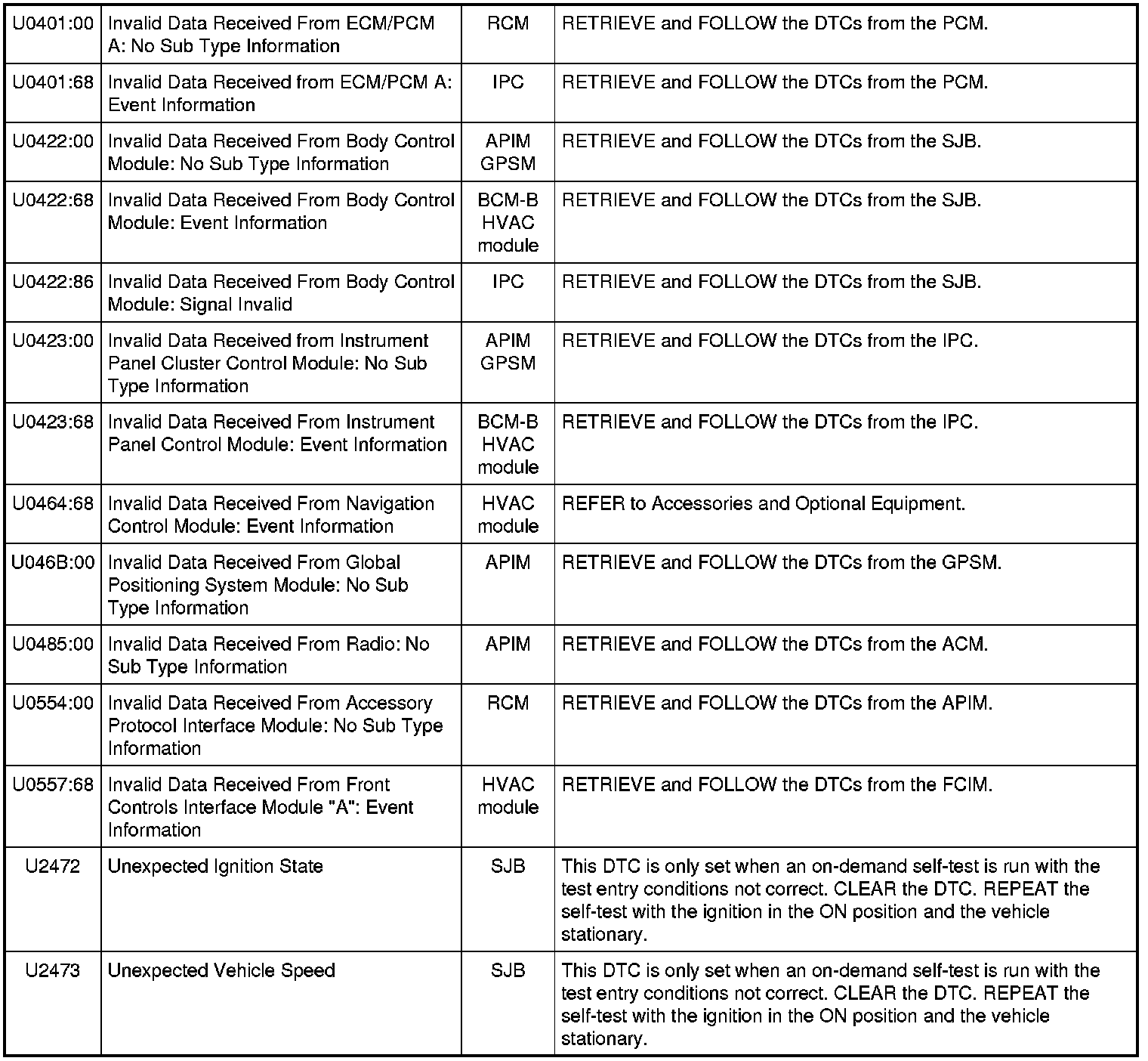 NOTE: Network DTCs (U-codes) are often a result of intermittent concerns such as faulty wiring or low battery voltage occurrences. Additionally, vehicle service procedures such as module reprogramming will often set network DTCs. Replacing a module to resolve a network DTC is unlikely to resolve the concern. To prevent repeat network DTC concerns, inspect all network wiring, especially connectors. Test the vehicle battery, refer to Battery.