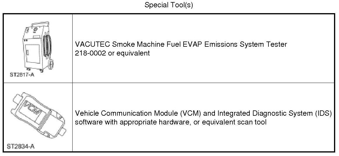 Introduce smoke from the VACUTEC Smoke Machine Fuel EVAP Emissions System Tester into the EVAP system and verify that smoke is exiting the fuel tank filler pipe neck area. For additional information, refer to the manufacturer's instructions.
