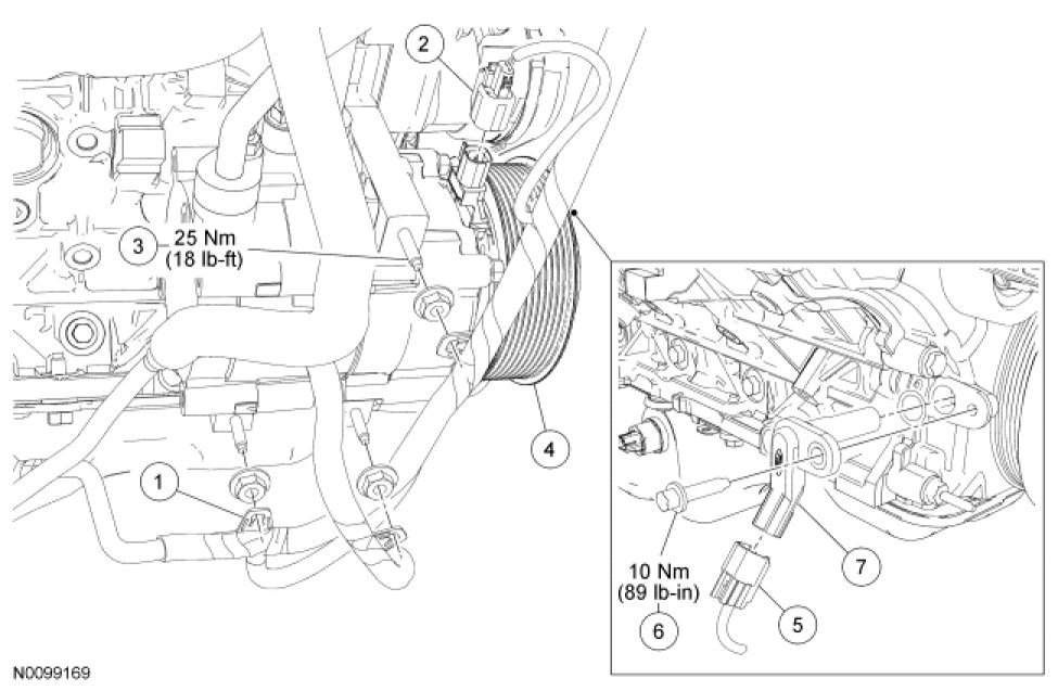 4. Disconnect the A/C compressor field coil and the Crankshaft Position (CKP) sensor electrical connectors.