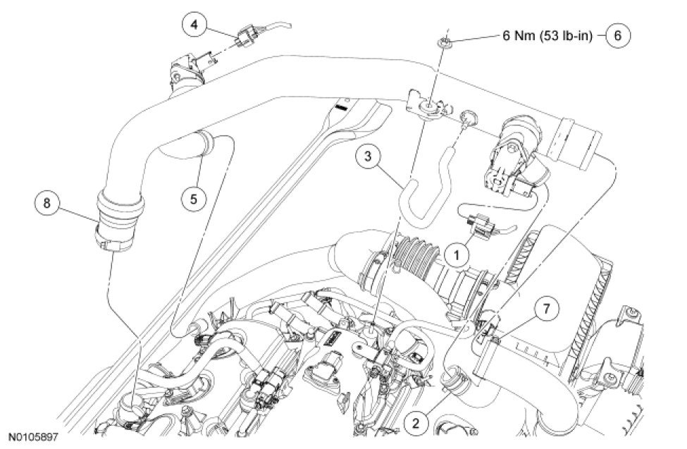 15. Connect the PCV tube quick connect coupling to the intake manifold. For additional information, refer to Fuel Delivery and Air Induction.