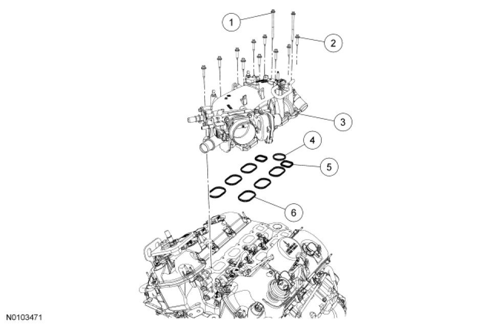 1. NOTICE: If the engine is repaired or replaced because of upper engine failure, typically including valve or piston damage, check the intake manifold for metal debris. If metal debris is found, install a new intake manifold. Failure to follow these instructions can result in engine damage.