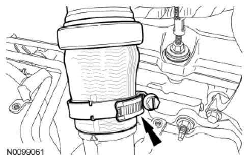Install the LH turbocharger intake tube to the LH turbocharger and tighten the clamp.