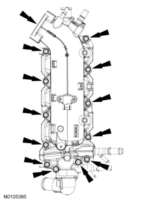 44. NOTICE: If the engine is repaired or replaced because of upper engine failure, typically including valve or piston damage, check the intake manifold for metal debris. If metal debris is found, install a new intake manifold. Failure to follow these instructions can result in engine damage.