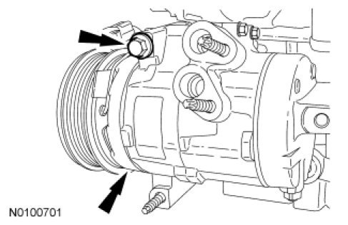 25. Remove the A/C compressor nut and the Catalyst Monitor Sensor (CMS) electrical connector bracket.